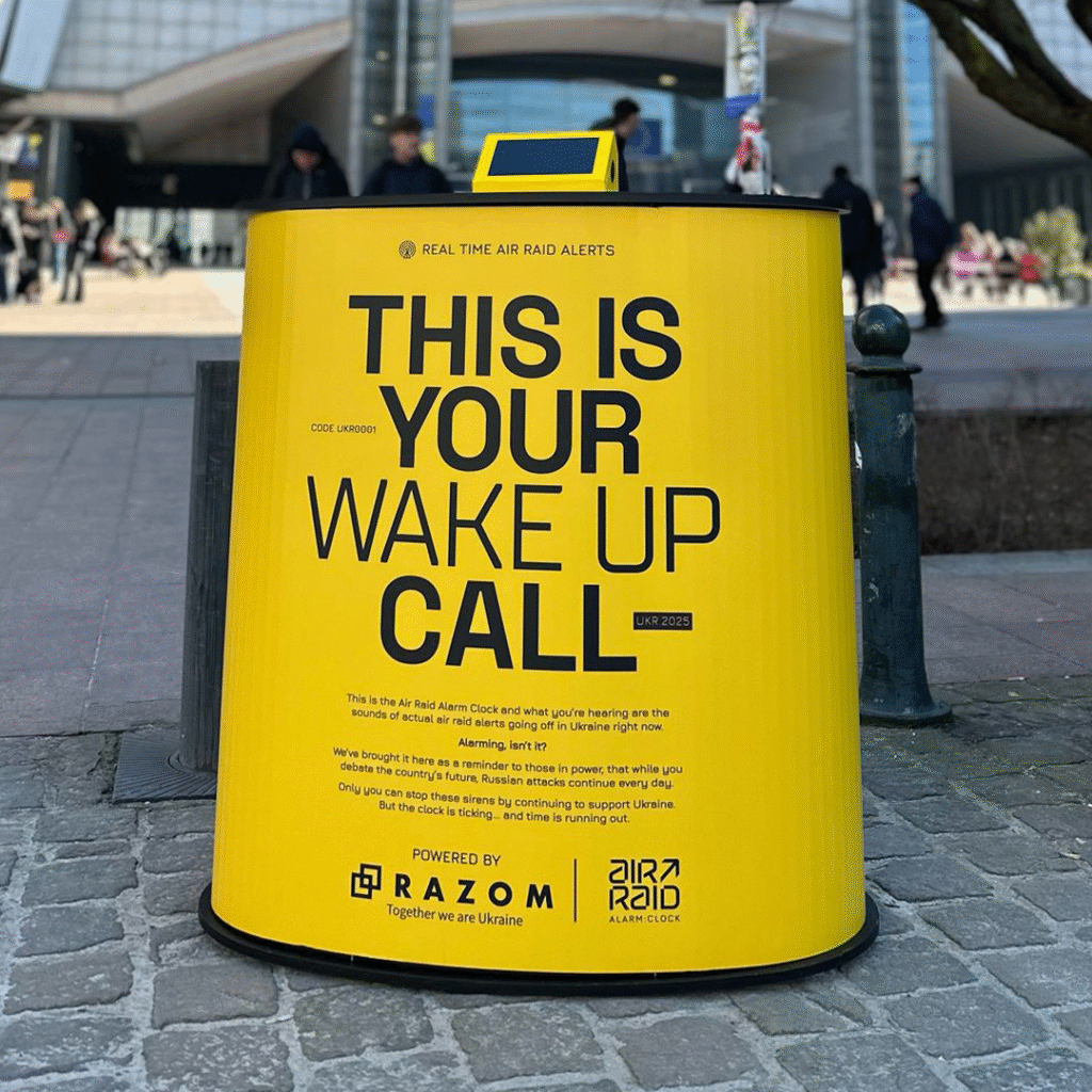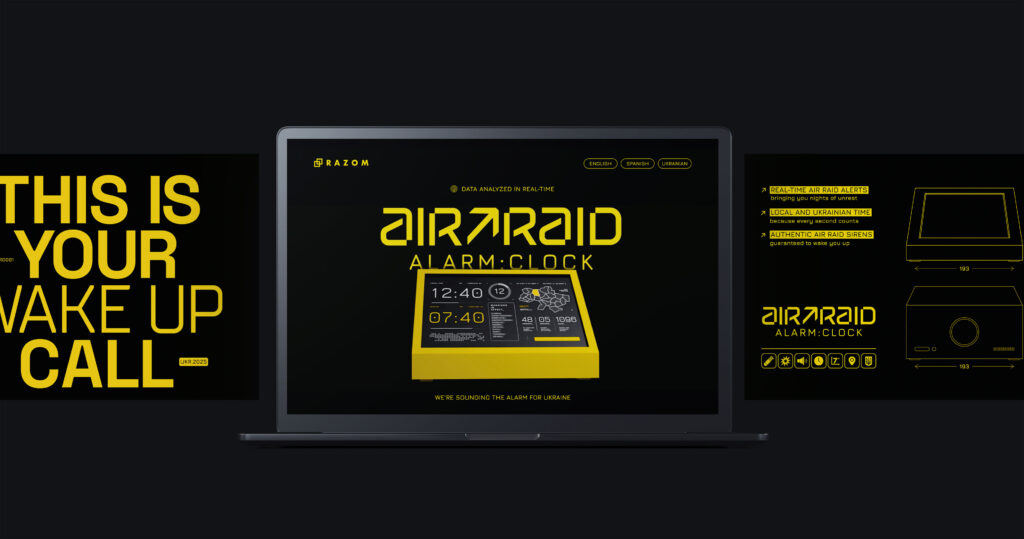 To raise awareness, we created the Air Raid Alarm Clock with Razom, a device synced to Ukraine’s air raid system, placed in Washington D.C. and outside the European Parliament as a powerful reminder.